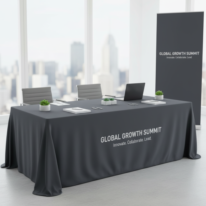 Custom table throw for corporate events & conferences. Branded tablecloth with logo—perfect for trade shows, meetings & exhibitions.