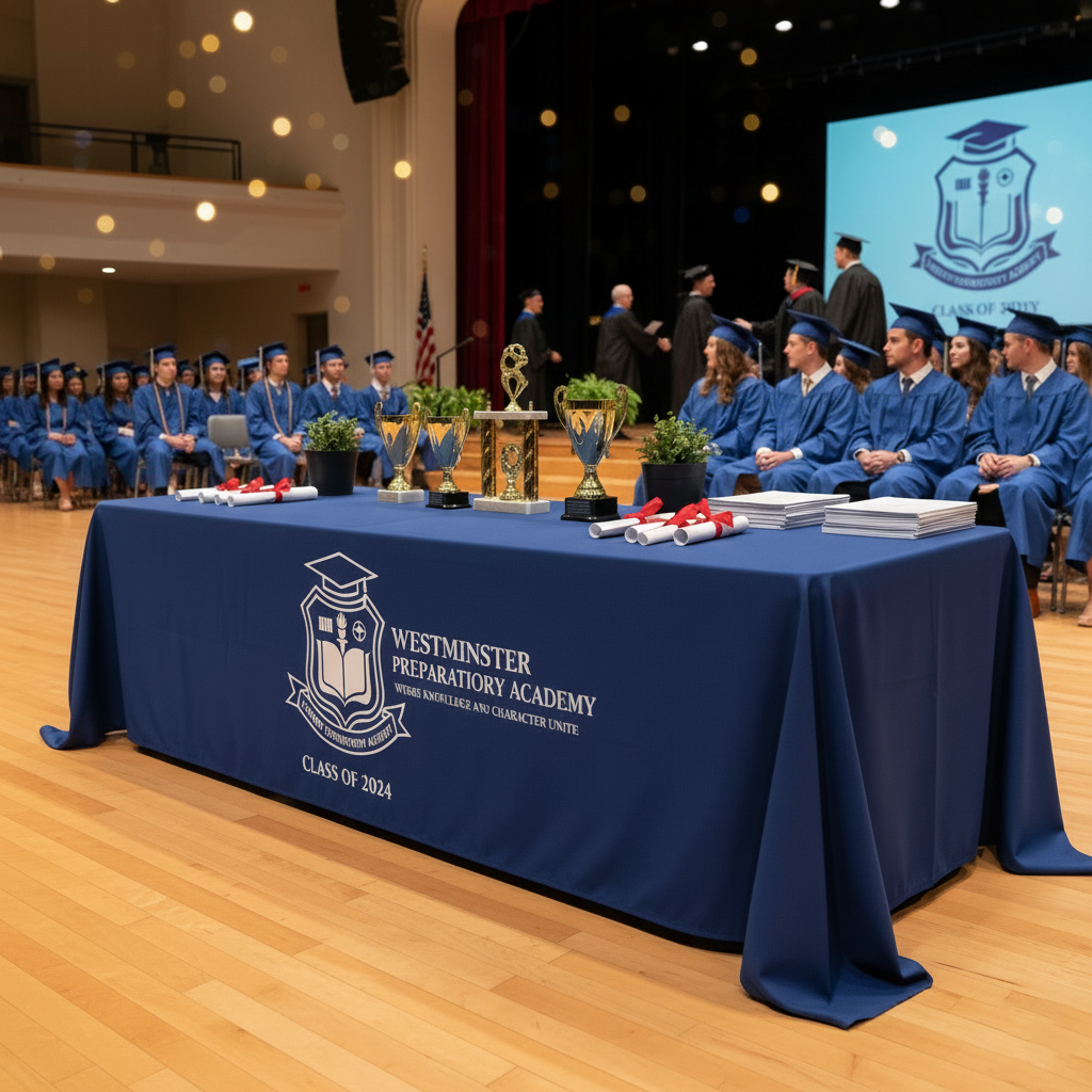 Create a polished awards table with custom printed school logo tablecloths. Perfect for graduations, ceremonies, and special school events.