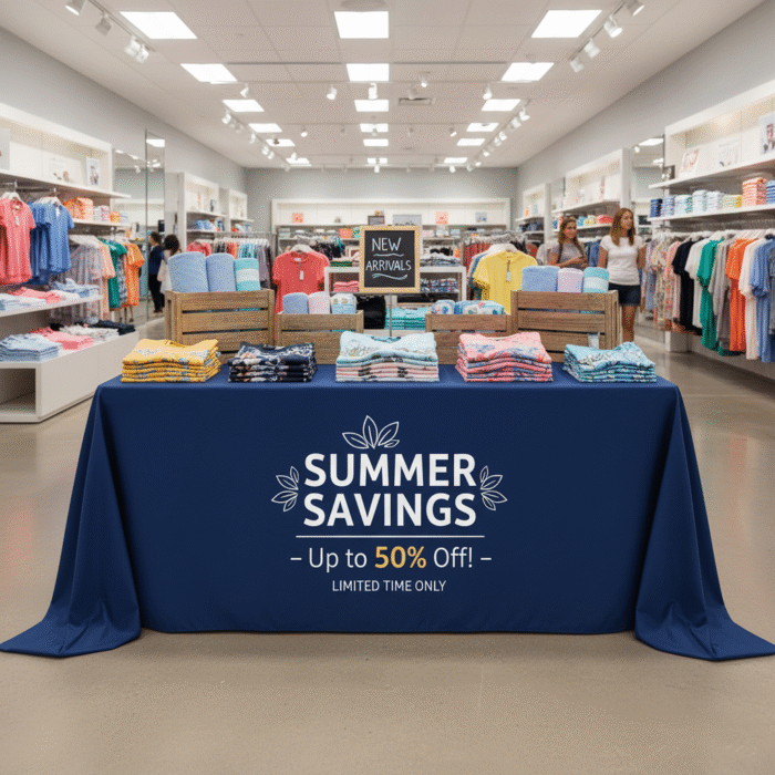 Custom Tablecloth for Retail Store Displays – Perfect for Promotions, Seasonal Sales & Brand Showcases